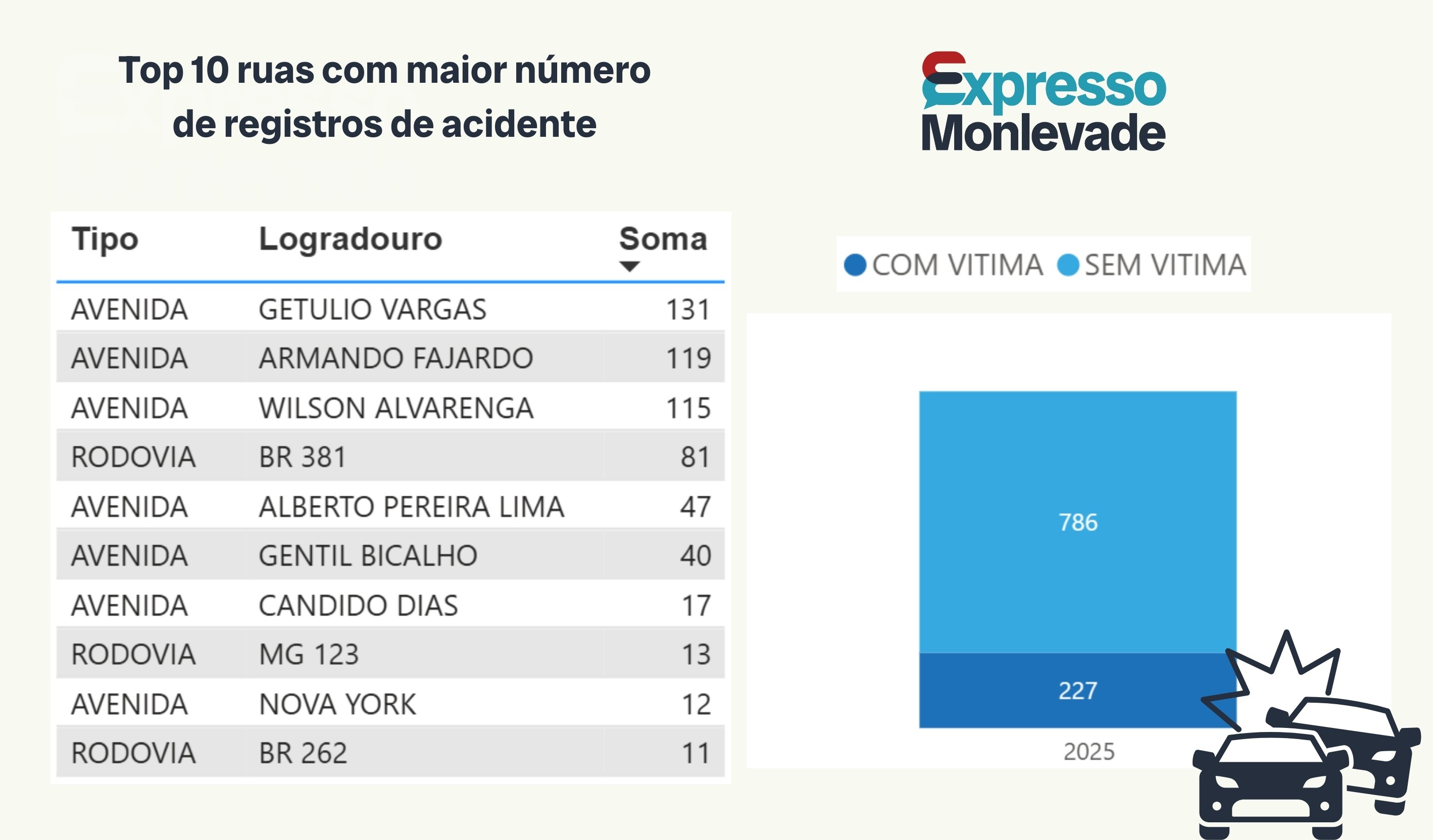 Dos mais de mil acidentes registrados em 2025, 786 acidentes (77,6%) ocorreram sem vítima e 227 acidentes (22,4%) tiveram vítimas. As ocorrências sem vítimas são aquelas em que não há feridos e os danos são exclusivamente materiais.