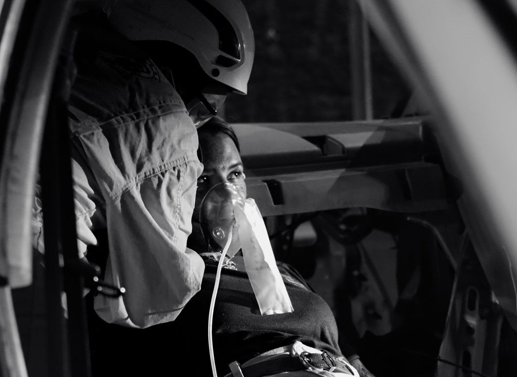 Caracterização de uma vítima de um acidente fictício, utilizando maquiagem. Simulado de resgate do Sevor, realizado em 2025.