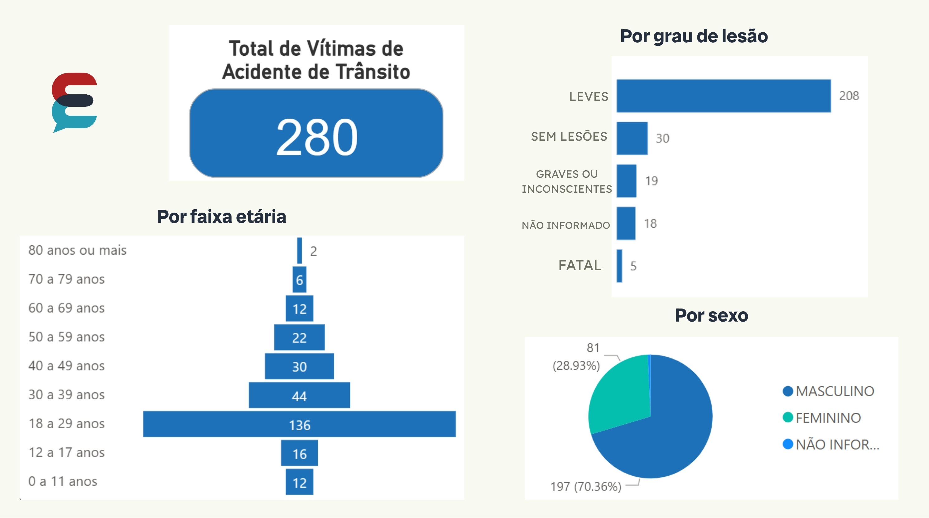 Dos mais de mil acidentes registrados em 2025, 786 acidentes (77,6%) ocorreram sem vítima e 227 acidentes (22,4%) tiveram vítimas. As ocorrências sem vítimas são aquelas em que não há feridos e os danos são exclusivamente materiais.