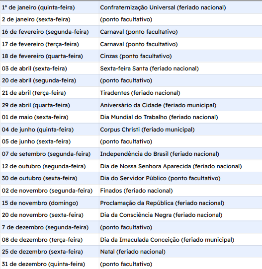 Em relação aos feriados municipais, a Prefeitura Municipal de João Monlevade vai avisar, por meio de decretos, sobre a adesão aos possíveis pontos facultativos.
